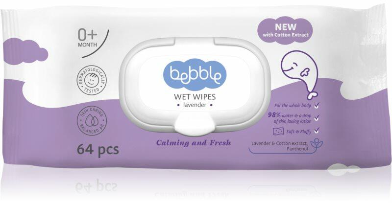 Bebble Wet Wipes Lavender, 64 db, Nedves törlőkendők gyermekeknek gyermekeknek, A tisztító Bebble Wet Wipes Lavender törlőkendők egyszerűen, gyorsan és megbízhatóan tisztítják a gyermekek bőrét. Tulajdonságok: nyugtatja a bőrt kellemes illatú felülete puha eltávolítja a szennyeződéseket Összetétel: legalább 98%-ban természetes eredetű összetevőket tartalmaz Használata: Tisztítsa meg a gyermek bőrét kímélően a kendővel. Használja szükség szerint. A törlőkendők egyszeri használatra szolgálnak.