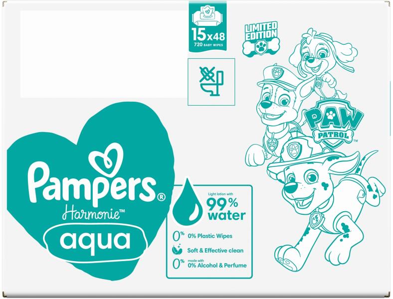 Pampers Mancs Őrjárat Harmonie Aqua Plastic Free műanyagmentes nedves törlőkendő 15x48 dbALLEGRO