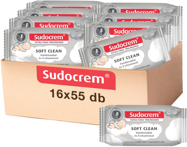 Sudocrem Soft Clean törlőkendő 16x55 lapos kiszerelésben a gazdaságos megoldás! A Sudocrem törlőkendő nagyon puha, mégis erős és hatékony a babapopsi megfelelő ápolásában. Panthenollal és E-vitamminnal gazdagítja a bőr hidratáltságát.